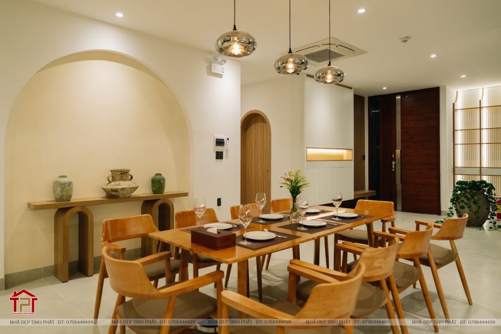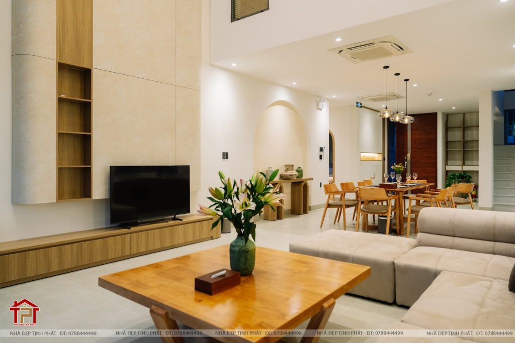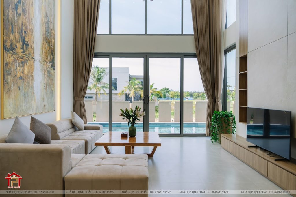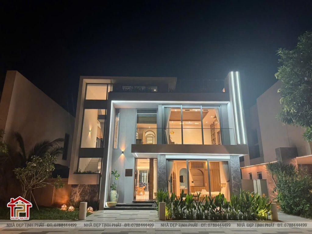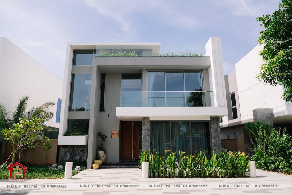 Kiến trúc hiện đại sang trọng: Mặt tiền nổi bật với các khối hình học vuông vức, mái phẳng, kết hợp kính lớn giúp ngôi nhà trông thanh thoát, tinh tế.