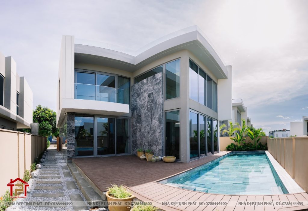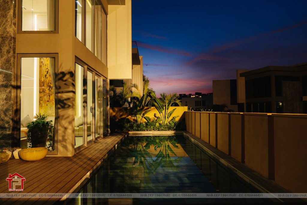 Hồ bơi ngoài trời xinh xắn: Thiết kế chiều dài phù hợp để thư giãn, mặt nước lúc về đêm được chiếu sáng màu xanh lam tạo hiệu ứng lung linh huyền ảo.