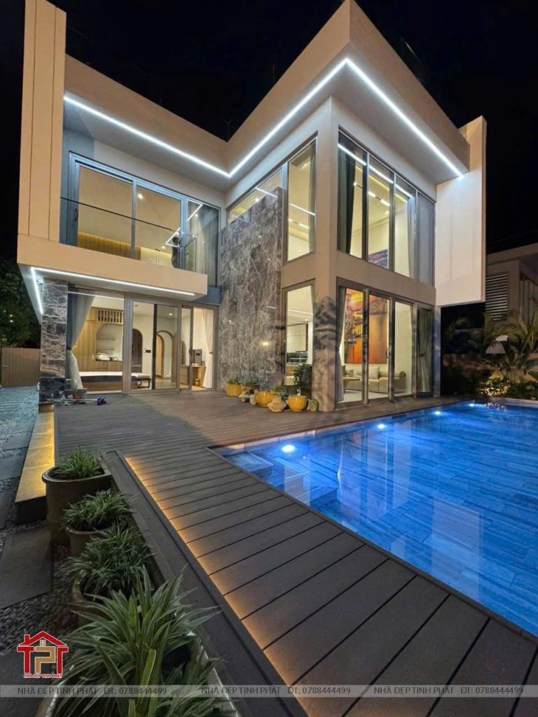 Sàn gỗ & hệ thống chiếu sáng chân hồ: Bố trí ánh sáng âm nền, kết hợp cây cảnh và lối đi lát đá, tạo không gian sinh hoạt ngoài trời ấm áp, sang trọng.